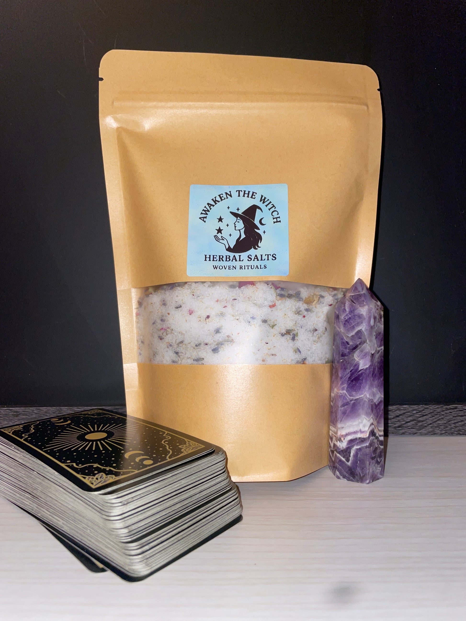Enhance your inner power and magik with Awaken the Witch herbal salts. Crafted with natural Epsom salts, herbs, flowers, and oils, it helps you tune into your higher self. Use as a footsoak or herbal bath to awaken your true potential.