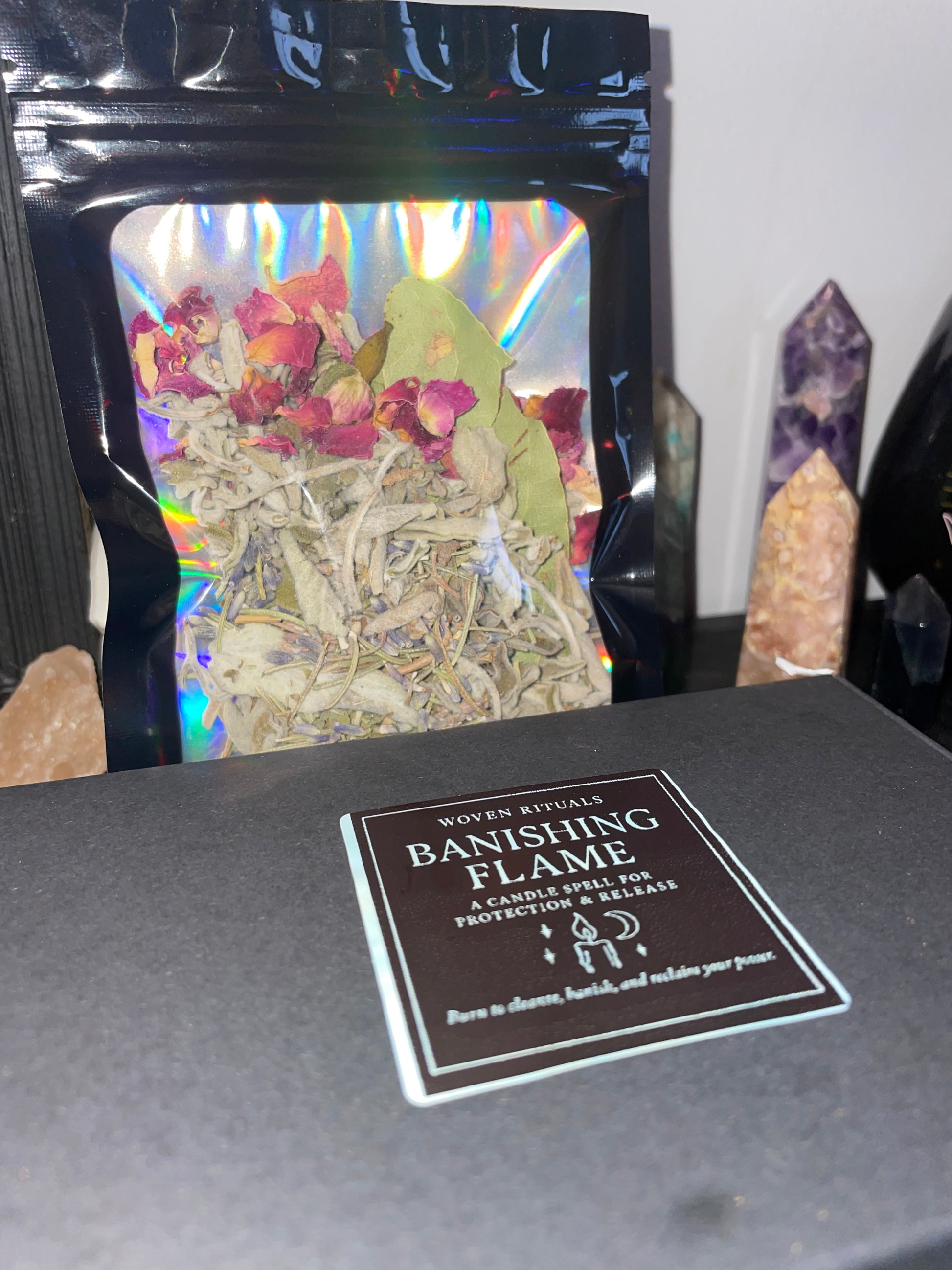 Banish negative energy with Banishing Flame ritual set. Each box contains 12 mini candles and a spell/ritual guide for spiritual protection and a herbal mix for the ritual. Perfect for those looking to protect their space from negative influences. Trust in the power of this expertly crafted set.
