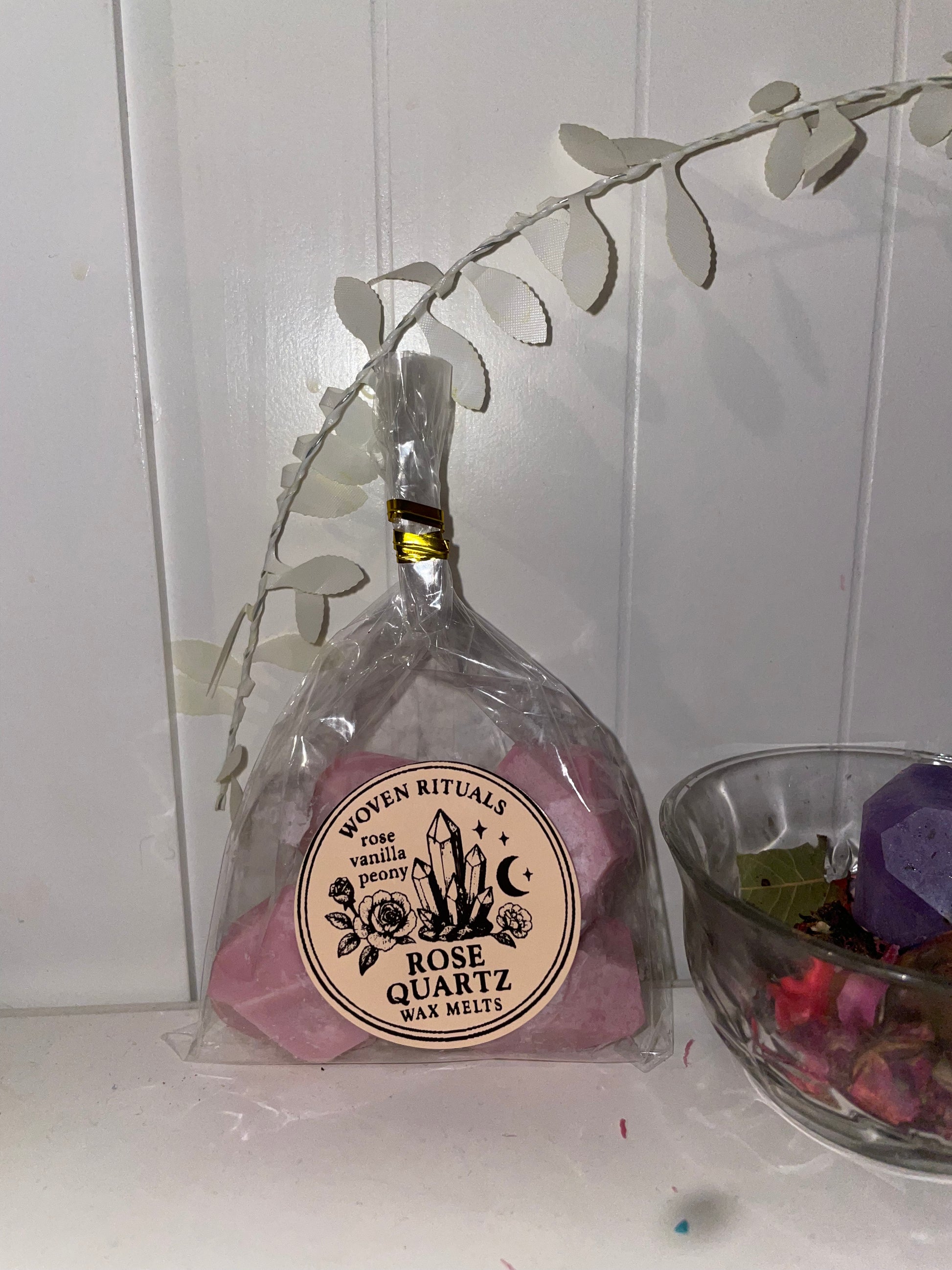 Experience a sense of calm with our Rose Quartz Crystal Wax Melts. Made with soy wax and infused with the soothing scents of rose vanilla and peony, these melts will bring a touch of peace and relaxation to your home. Let the healing properties of rose quartz crystal elevate your mood with every use.